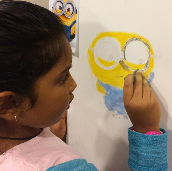 Jorge taught her from the basics, made her draw lines : thick ones, thin ones, curvy ones, circles, then she learned shading, light to dark. Every class she had to practice these basic skills before moving on to her drawings. As time went by, we started to see progress. Her drawings became more realistic and were able to capture attention.